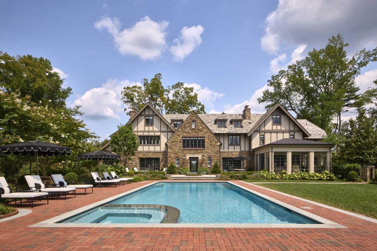 Rumbled® Full Range clay pavers from Pine Hall Brick Company are used in a dramatic installation around a swimming pool at a private residence in one of the most affluent suburbs in the United States. They were chosen both for their aesthetic beauty by themselves – and for their value in providing a foreground for a classic American estate.