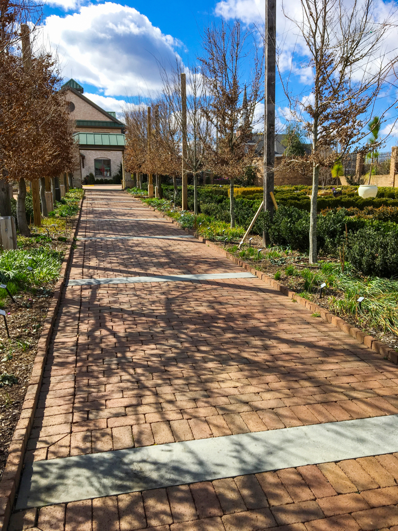 To get to the Pattern Garden, take the Rumbled® Cocoa paver walkway from the Welcome Center until you come to a pea gravel pathway that winds its way through paisley islands of beds, planted with bulbs about to explode in spring colors, defined by pavers and shrubs.