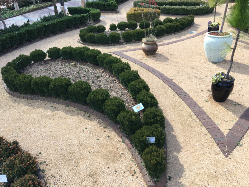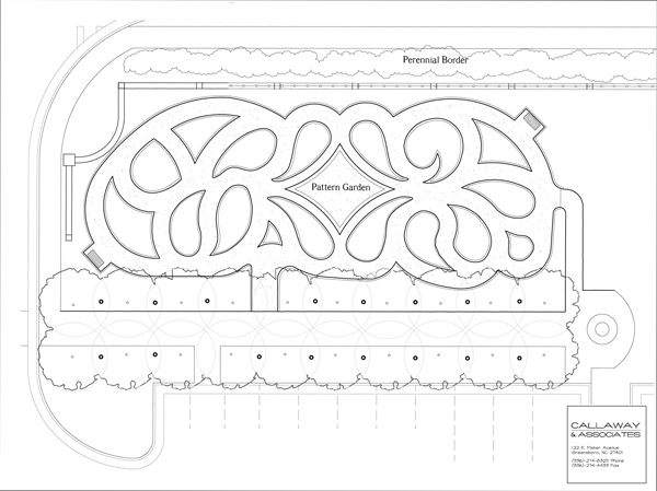 As the name suggests, the Ciener Pattern Garden, designed by Chip Callaway of Callaway & Associates, is a study in the method of pattern gardening which is defined by 14 pattern elements: