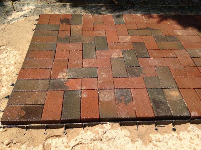 Fresh new patio project showing Full Range clay pavers in a herringbone pattern. You can see the edge restraints, secured with landscape spikes, soon to be covered with turf.
