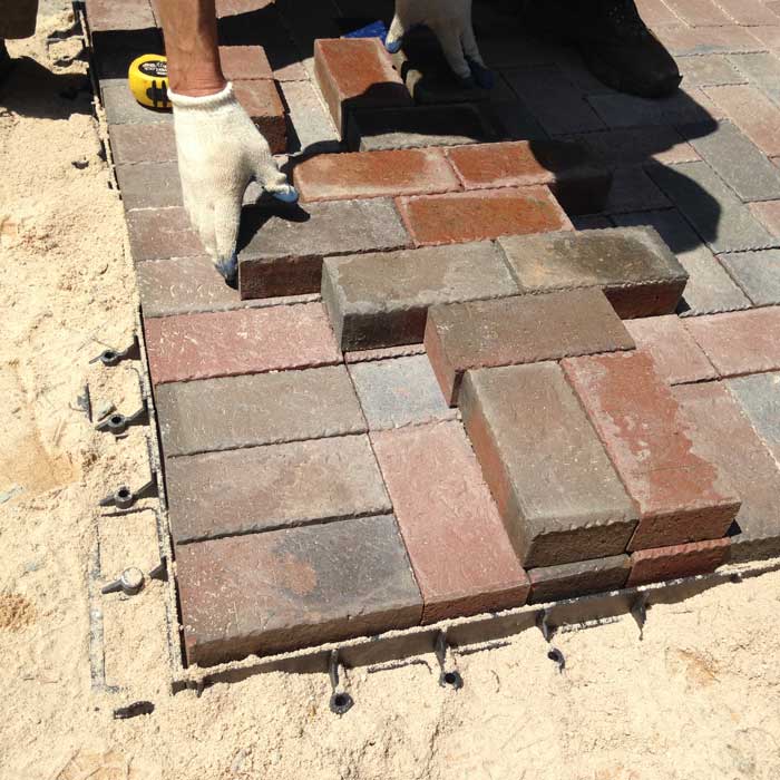 It’s the kind of job that you can take on yourself. Essentially, you dig down seven inches, compact the soil, put in four inches of crusher run gravel and one inch of sand, put in the pavers and edge restraints and fasten them down with landscape spikes.